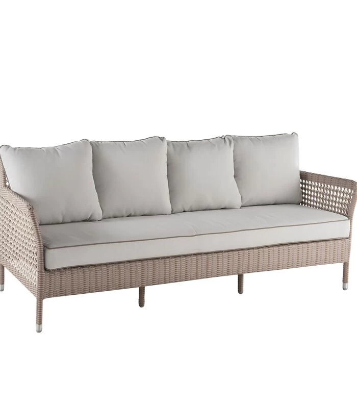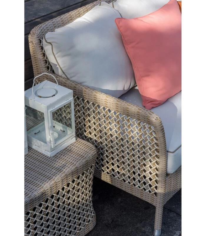 Dit is een hele mooie bank voor twee personen. Een voor twee personen en een voor drie personen. Een prachtig weefwerk van drie kleuren hars in de geest van het ouderwetse open riet. Van KOK Maison, rotan specialist sinds 1920.