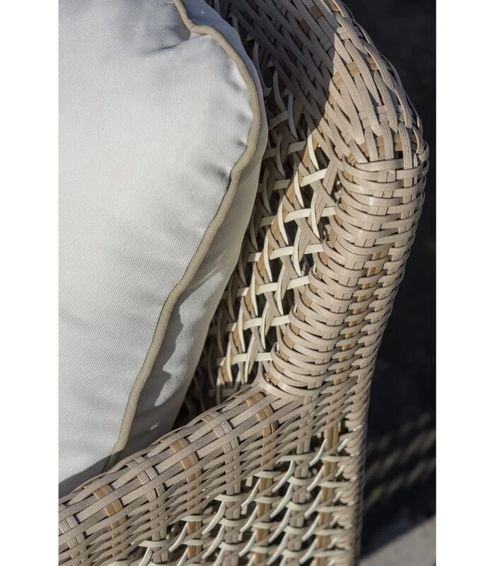 Eenvoudige en compacte lijnen voor deze fauteuil in Antibes KOK MAISON Kunstvezel, met een mooi vlechtwerk. Wij vervlechten drie kleuren resin om de wit/beige tinten van de riffen bij eb na te bootsen, dit alles in een vlechtwerk in de geest van het oude open weven. Deze collectie is overal te vinden en blijft zeer verfijnd, hij vindt natuurlijk zijn plaats aan zee, op oude teakhouten dekken, in chalets, in de bergen, of op de fiets. Dimensies: Hoogte 80 X breedte 66 X diepte 75 – zitting 41.Het kussen is gevuld met polyetherschuim 30kg/m3 voor de zitting en polyester watten voor de rugleuning. De stoel is geschikt voor gebruik buitenshuis: polyethyleenkunstvezel met hoge dichtheid; gegarandeerd tegen UV, slecht weer, grote temperatuurschommelingen (–15°C, +55°C), zout aan zee. Rattan specialist sinds 1920, KOK MAISON biedt kwaliteitsmeubelen, comfortabel en bestendig, niet alleen door de keuze van de materialen maar ook door de zorgvuldige zorg die aan elk detail van hun onderdelen wordt besteed. Constructie: Geluiddempend en hittebestendig: Structuur in gelakt aluminium. Weven in hoge dichtheid polyethyleen Kunstvezel. Kussen: 30kg/m3 polyethyleenschuim voor de zitting en polyester watten voor de rug. Stof 100% olefine