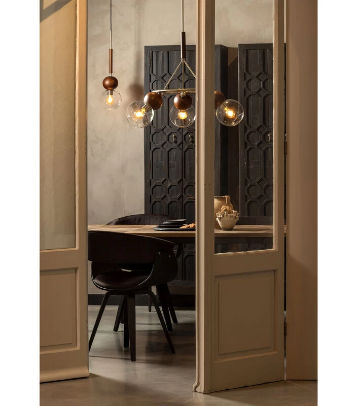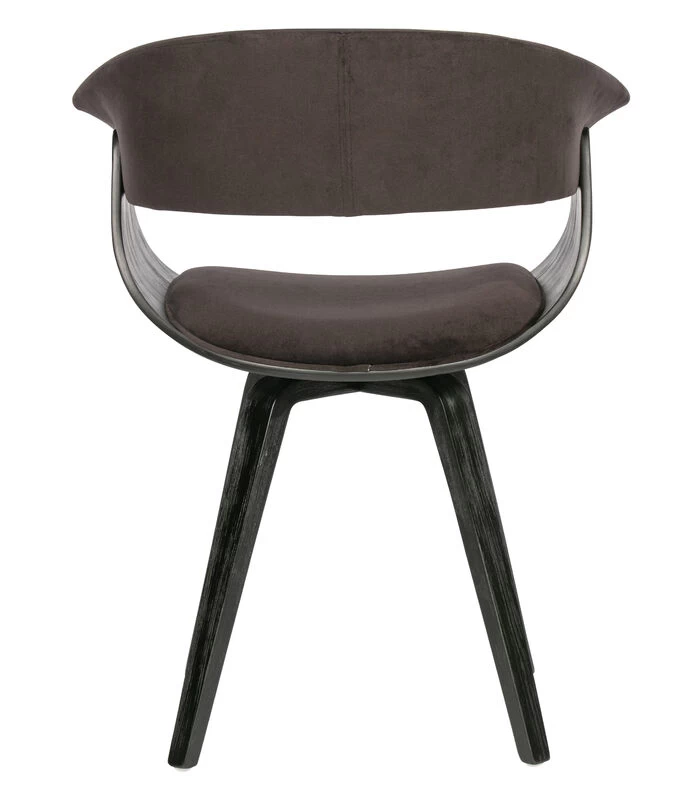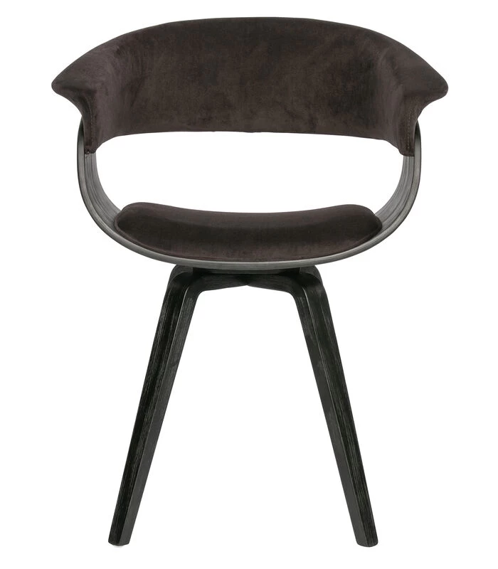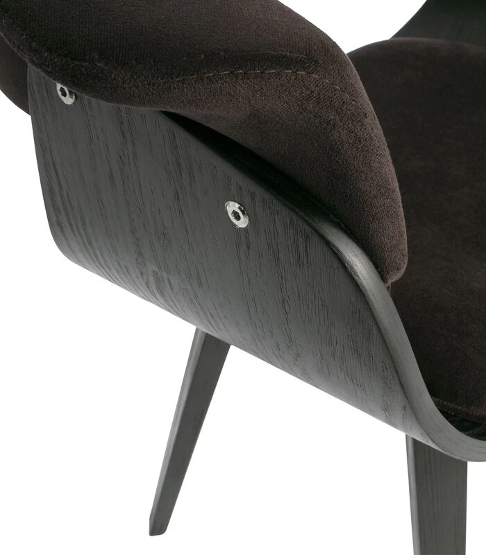 De stijl van de eetkamerstoelen Catch van BePureHome is modern met een knipoog naar de retro stijl van vroeger. De stoel zit heerlijk, dus je kunt er gerust een hele avond mee aan tafel blijven zitten. Het houtlook onderstel en de ronde kuipzitting zijn gemaakt van multiplex en voorzien van een fineerlaag in de kleur zwart waarbij de nerven een echt houteffect geven. De zitting, armleuningen en rugleuning zijn gestoffeerd in een luxe fluweelzachte velvet stof in de kleur donkerbruin. De combinatie van deze stof met de houtlook basis, maakt dat de stoel een warme design sfeer uitstraalt.