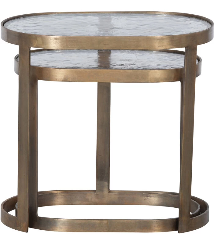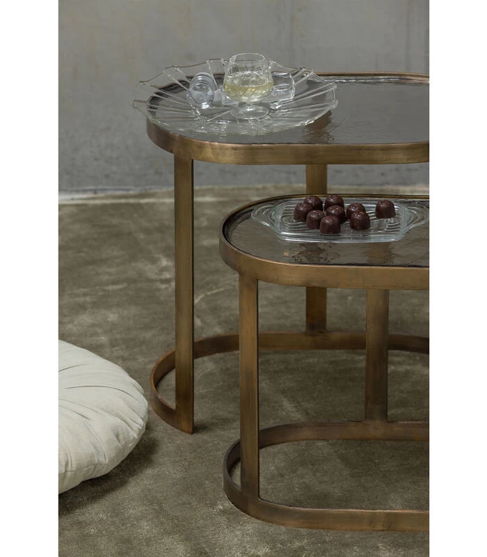 De Clean bijzettafelset van twee, uit de collectie van het Nederlandse interieurmerk BePureHome, is een opvallend paar met een chique uitstraling. Het goudkleurige metaal omrand transparante glazen bladen met een indrukwekkende structuur. Dit maakt de Clean tafels tot charmante en opvallende items.