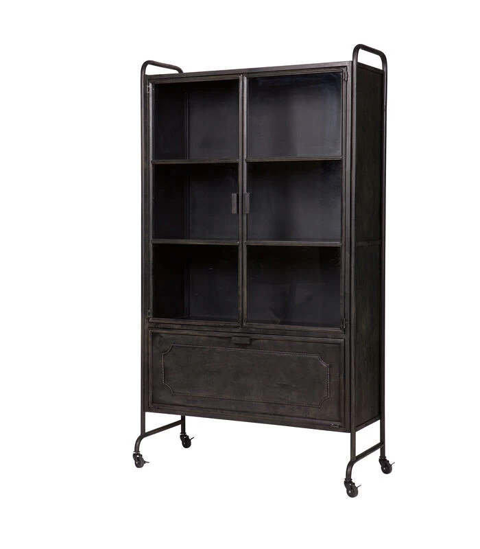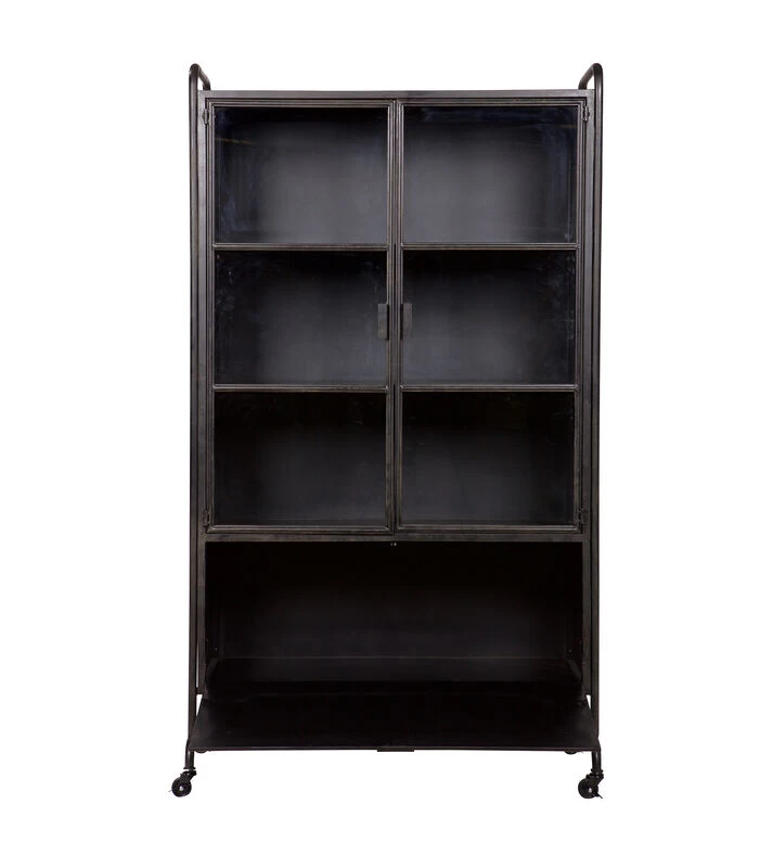 Een vitrinekast, maar dan wel net even anders.. Namelijk lekker stoer! Deze vitrinekast is gemaakt van zwart metaal en staat op zwenkwielen die voorzien zijn van een blokkeerstand (rem). Achter de twee glazen deuren bevinden zich drie royale legplanken en daaronder zit een handige opbergruimte voor losse rommel. Deze wordt afgesloten met een klepdeur (naar beneden). Deze vitrinekast heeft een industriële, vintage uitstraling en geeft het interieur een stoere touch.