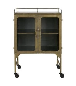 Uniek en origineel, een kleinere variant vitrinekast op wielen! Deze Talent vitrinekast staat op wielen, wat er voor zorgt dat je de kast makkelijk kunt verplaatsen. Dat geeft Talent ook net die verrassende touch. Je kunt de wielen ook blokkeren, dan kom je niet voor verrassingen te staan. Het kastje beschikt over een plank in het midden, zodat je twee verschillende niveaus hebt om je spullen tentoon te stellen en wordt afgesloten door middel van twee deurtjes met glas erin. Talent is gemaakt van metaal en afgewerkt in de kleur antique brass. Jouw persoonlijke schatten komen echt tot recht in deze eyecatcher.