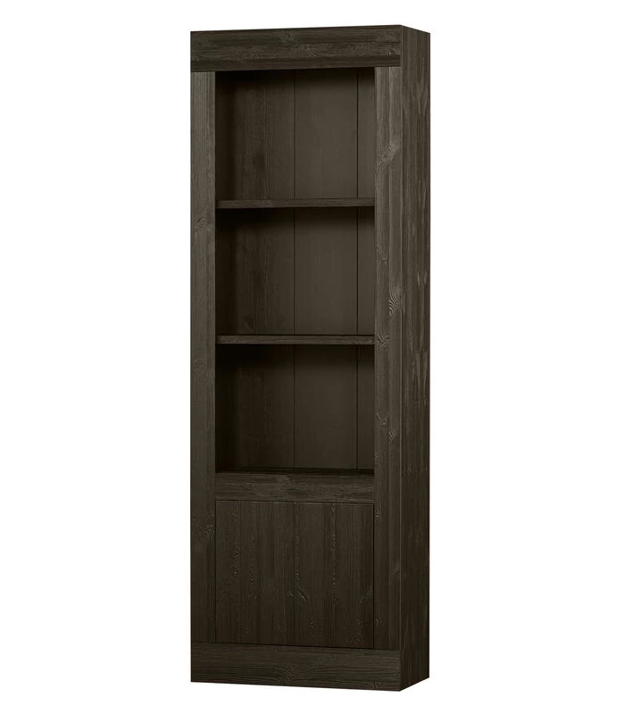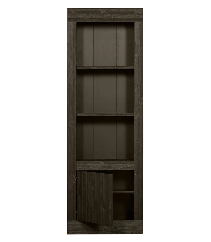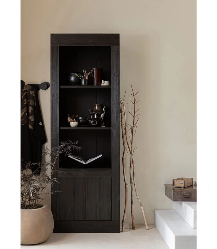 Het item is vervaardigd uit diep geborsteld grenenhout. De grenenhouten meubelen uit onze collecties zijn FSC–gecertificeerd en worden op diverse manieren behandeld. Zo is geschuurd grenen zeer glad en netjes en staat geborsteld grenen juist bekend om zijn karakteristieke nerftekeningen en doorleefde uitstraling. Voor een nog robuustere look wordt het grenenhout band gezaagd. Grenenhout wordt gekenmerkt door een lichtgele kleur en zichtbare vlamtekeningen. De zwarte legplanken buiten het zicht zijn gemaakt van spaanplaat (fsc) en de zwarte achterwand is gevormd uit HDF (fsc).