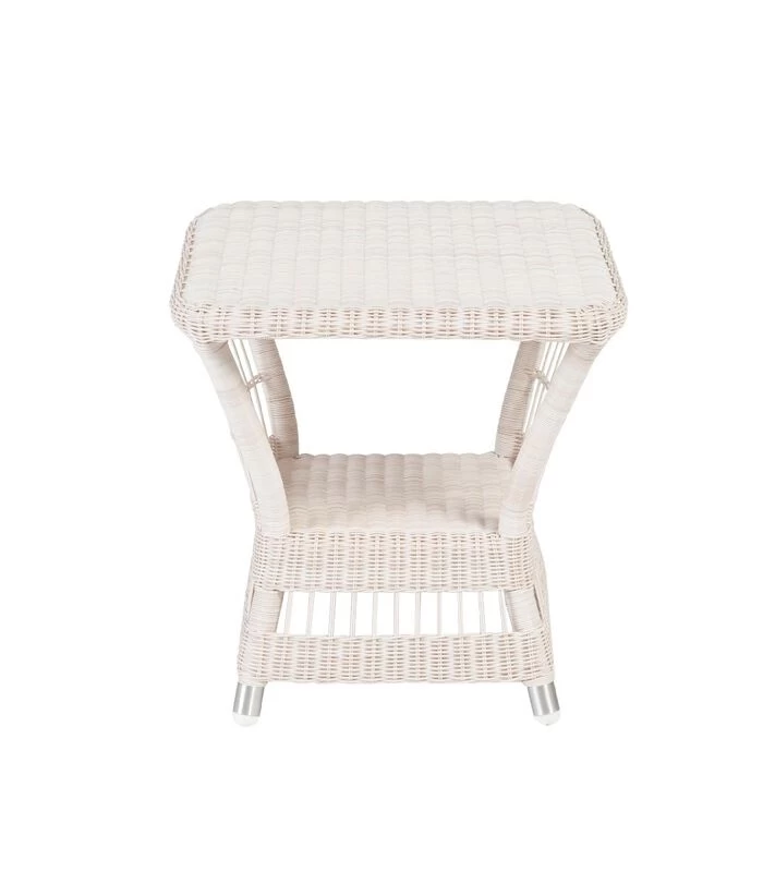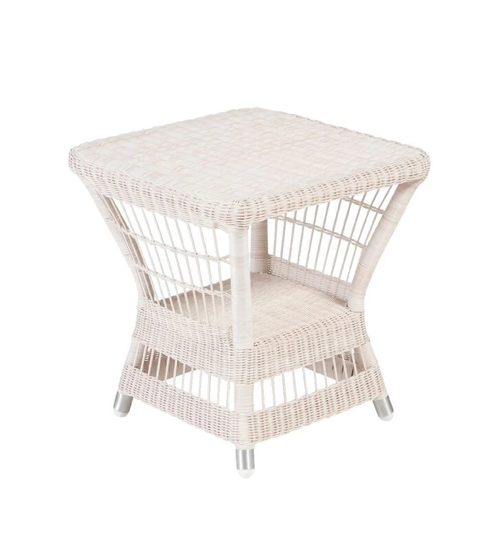 De Biarritz rotan buitentafel is gebaseerd op de stijl van het meubilair dat men aantrof op de terrassen van koloniale huizen. Het is ongelooflijk dicht bij wit, vandaar de naam: “”synthetische rotan””. Hierdoor is de tafel zeer licht, optisch zeer luchtig en weerbestendig. Totale afmetingen: hoogte 47 x breedte 46 x diepte 46. Gepoedercoat aluminium frame, HDPE Kunstvezelvlechtwerk. Gemaakt in Indonesië .Bestand tegen weersomstandigheden: regen, sneeuw, zon, zeezout, en zelfs zwembadchloor, onze outdoor rotan collectie is ontworpen voor buitengebruik: HDPE (hoge dichtheid polyethyleen) behandeld tegen UV, en gegarandeerd tussen –15 °C en +55 °C, gepoedercoate aluminium structuur.