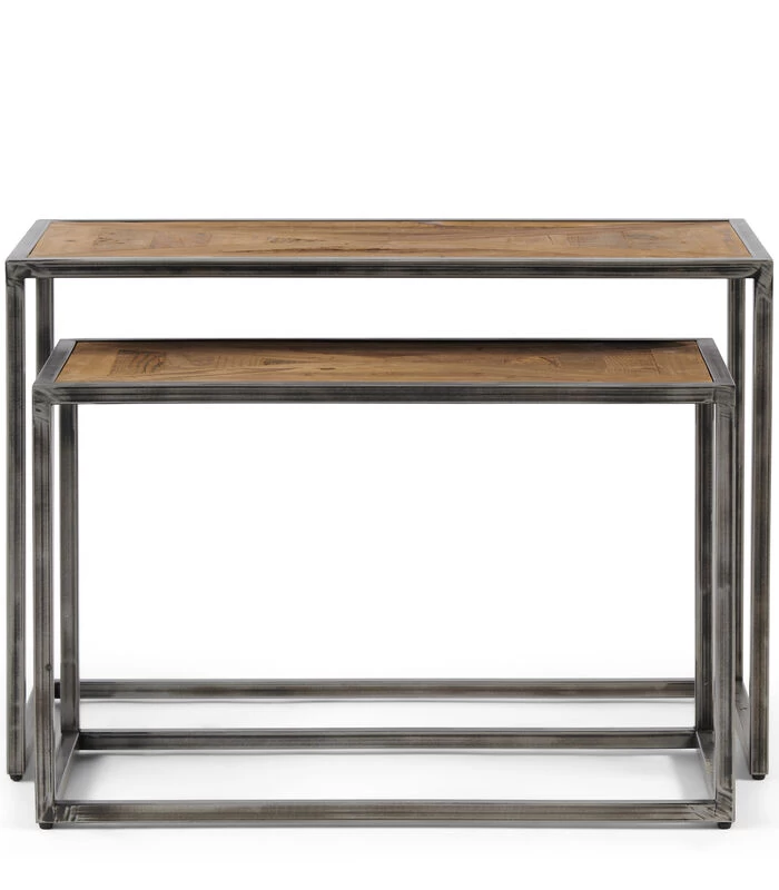 Een nieuwe toevoeging aan de Le Bar American–serie is deze set van twee bijzettafels. Gebruik de tafels los van elkaar of schuif de kleinere variant geheel of gedeeltelijk onder de grote. De tafelbladen zijn gemaakt van gerecycled eiken– en essenhout en het onderstel is vervaardigd uit metaal.