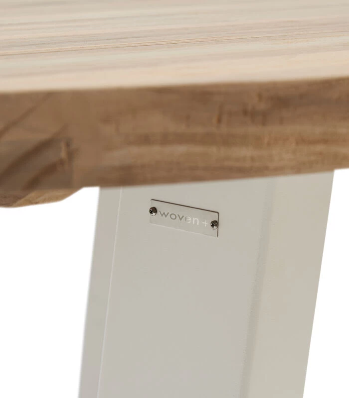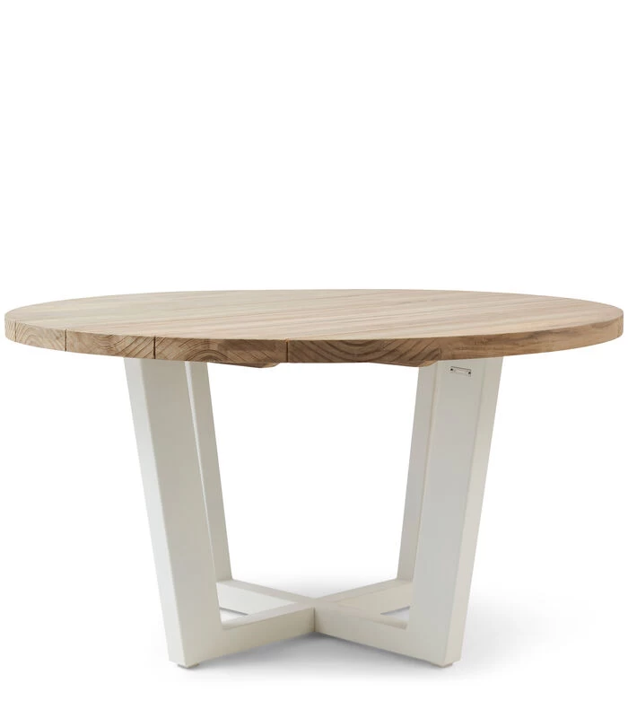 Ronde eettafel voor buiten, voor die heerlijke zomerse dagen. Het glad afgewerkte tafelblad is van dikke teakhouten panelen, de vier poten die onderaan een stevig kruis vormen, zijn van aluminium en zijn er in twee kleuren. De diameter van deze tafel is 140 cm, dus daar kunnen wel een paar mensen aan zitten.