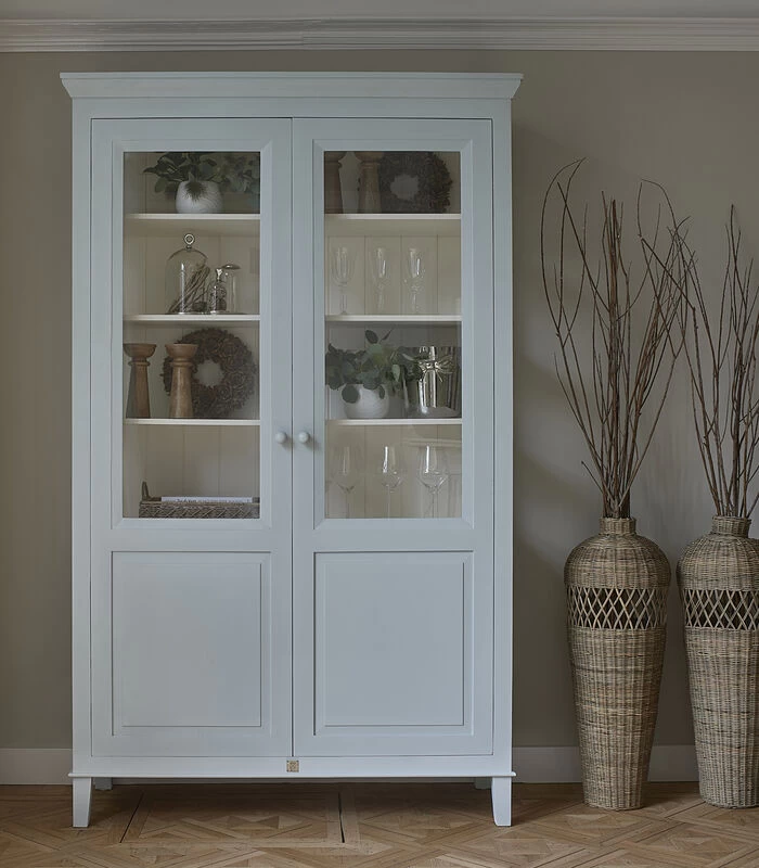 Deze vitrinekast van mangohout combineert twee lichte kleuren: binnenin offwhite en buiten een zachte grijsachtige tint, die, als was het een kameleon, met zijn omgeving meekleurt. De deuren zijn bovenin en aan de zijkanten voorzien van glas en de planken zijn uitneembaar. Zo creëer je zelf je eigen kastindeling.