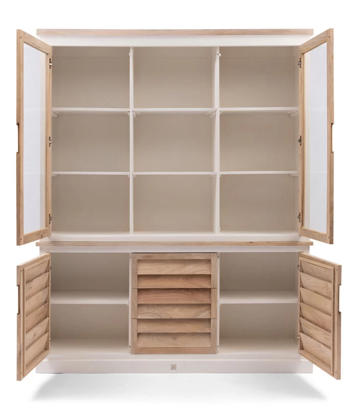 In wit hout met naturel mangohout is dit de XL–buffetkast uit de Pacifica–serie. De meubels uit deze serie vallen op door het gebruik van shutters op de deuren en lades. Het bovendeel heeft twee deuren met glas en een open deel. Alle deuren sluiten met softclose–techniek. In deze serie zijn verschillende meubels verkrijgbaar.