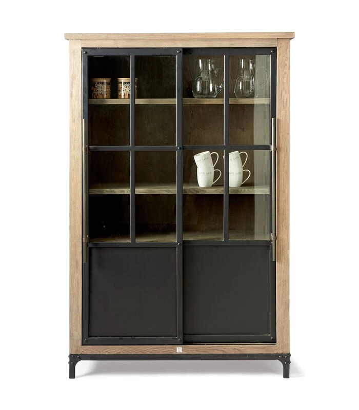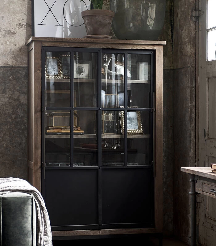 Deze mooie kast is het kleinere broertje van de Hoxton Cabinet. Dit compactere model is door het gebruik van gerecycled essenhout in combinatie met staal weer net zo stoer. De hoogte van deze fijne buffetkast is 170 cm en door de twee schuifdeuren is het ook erg leuk om de deuren half open te zetten.