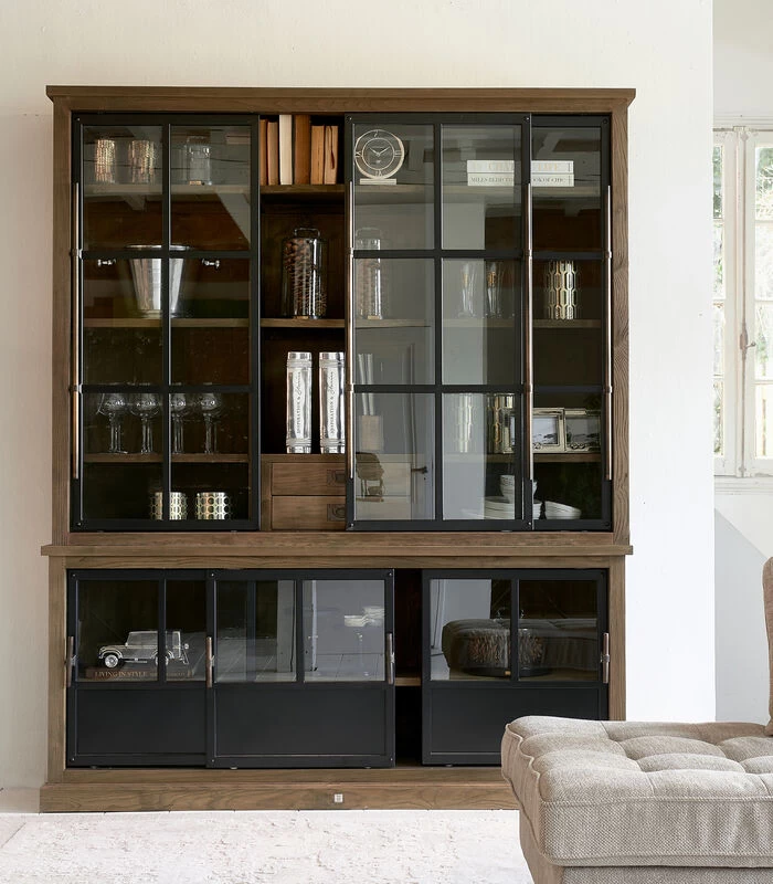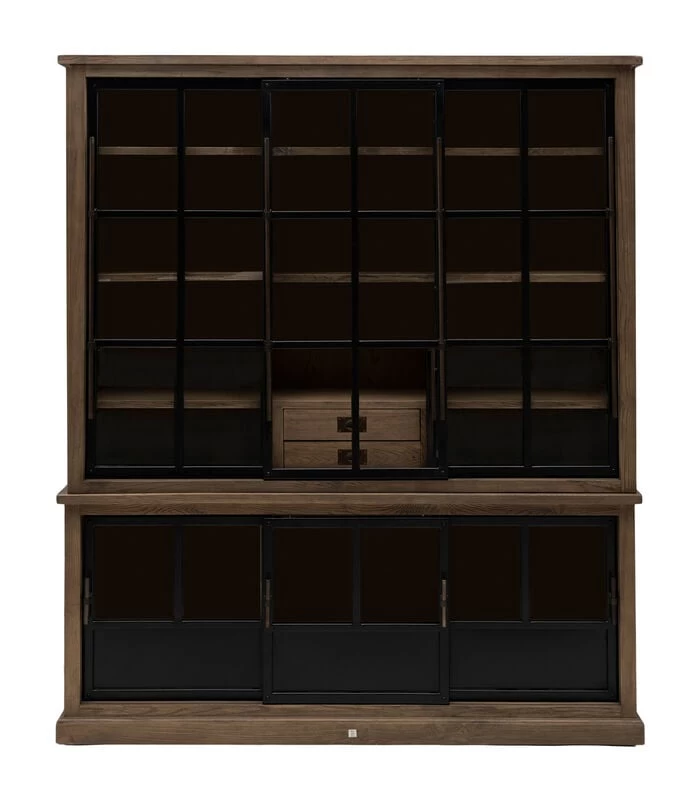 De Hoxton is een industriële kast gemaakt van gerecycled essenhout in combinatie met zwartgekleurd ijzer en glazen panelen die de kast afsluiten voor stof en vuil. Doordat de schuifdeuren achter elkaar langs schuiven, is het ook mogelijk om het middendeel open te laten voor een speels effect.