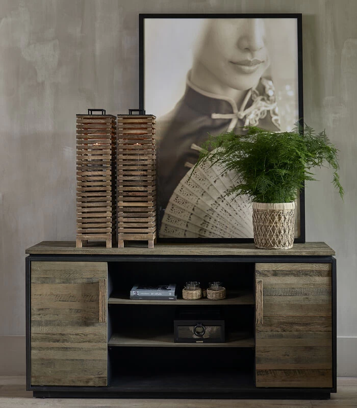 Speel met ruimte en opstelling met dit dressoir uit de Saratoga Hills–collectie. Deze kast is gemaakt van gerecycled eikenhout, in twee verschillende kleuren, namelijk naturel en donker gebeitst. Zo zijn het blad, de planken en de twee schuifdeuren licht van kleur. Door de schuifdeuren te verplaatsen, kies je zelf welke planken in het zicht komen.