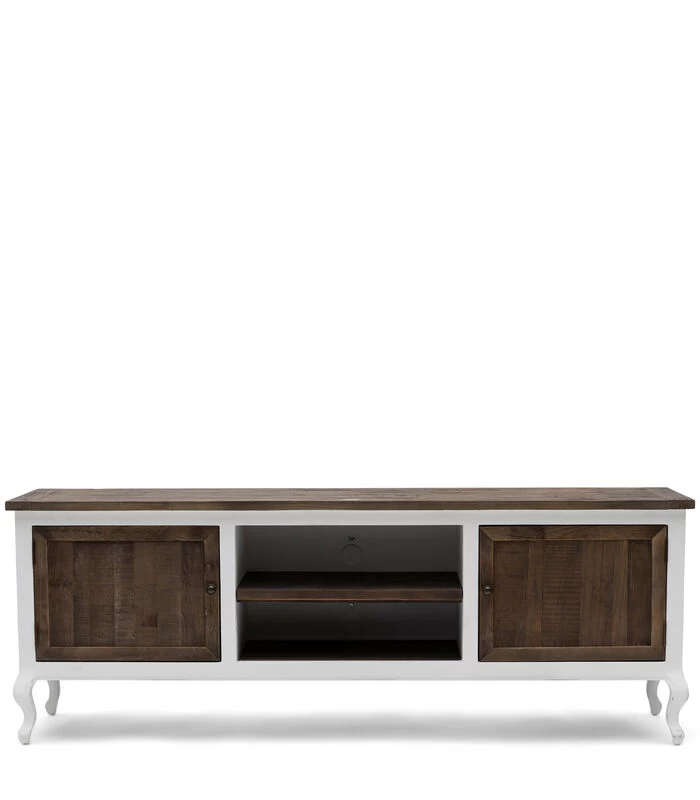 Dé perfecte plek voor uw flatscreen. Charmant door de sierlijke poten, maar ook stoer door het materiaal. Het blad is gemaakt van oude, houten schuurdeuren. Achter de deurtjes is ruimte voor al uw dvd’s of cd’s.