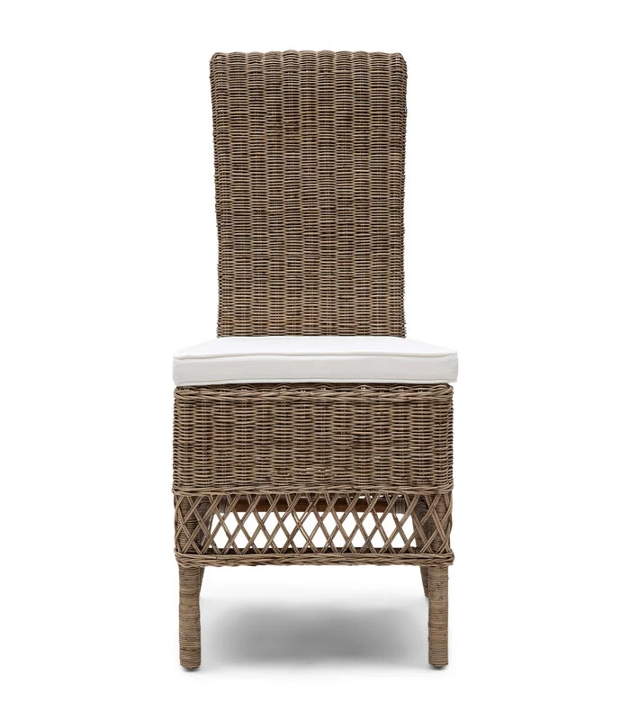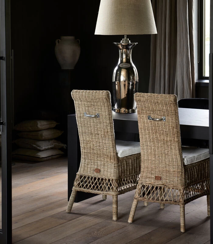 Een handgevlochten dinerstoel gemaakt van natuurlijk materiaal, de natuurlijke bruine kleur wordt gecreëerd door een natuurlijk proces hierdoor kan kleur per levering licht verschillen waardoor ieder meubel uniek is. Het zitkussen is gemaakt van 100% katoen.