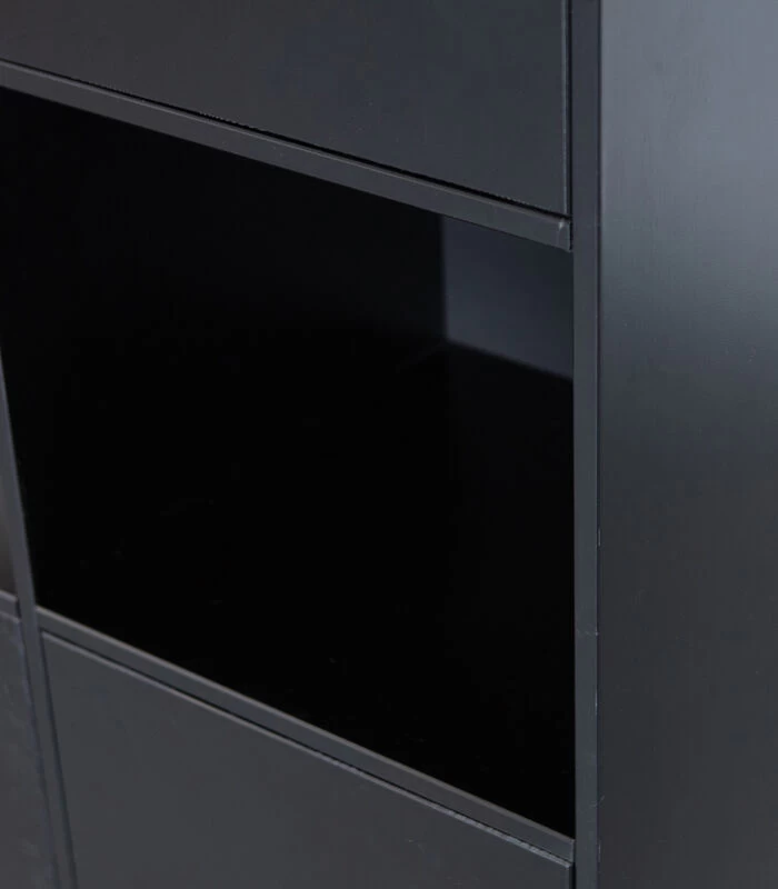 De Finca opbergkast met rond element is een waar pronkstuk in de woonruimte. De open vakken zijn gelijkmatig ingedeeld voor het presenteren van jouw mooiste woondecoratie. De drie deuren houden nog eens een ruime opbergruimte uit het zicht. De vakken hebben een hoogte van 32 cm en een diepte van 37 cm. De onderrand van de opbergkast laat 7 cm ruimte over aan de voorzijde, hierdoor lijkt het meubel te zweven.