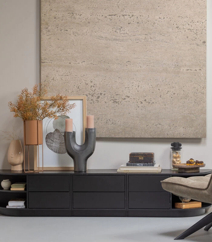 Het tv meubel heeft twee ruime laden met elk een inhoud van 11,5x68x30 cm (hxbxd). De onderrand van het Finca tv meubel laat aan de voorzijde 7 cm ruimte, hierdoor lijkt het alsof het tv meubel zweeft.