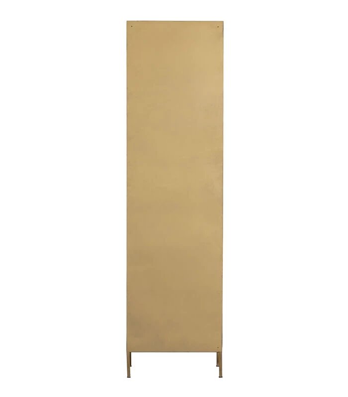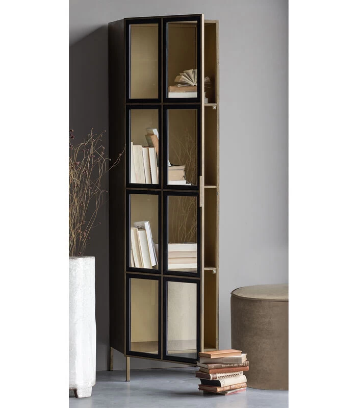 De slanke Holy vitrinekast komt uit de collectie van het Nederlandse merk WOOOD. De Holy kast is gemaakt van metaal met een antique brass kleurige finish. De kastdeur heeft acht transparante raamwerken omrand met ieder een houten frame. De deur klemt vast door middel van een magneet achter de handgreep.