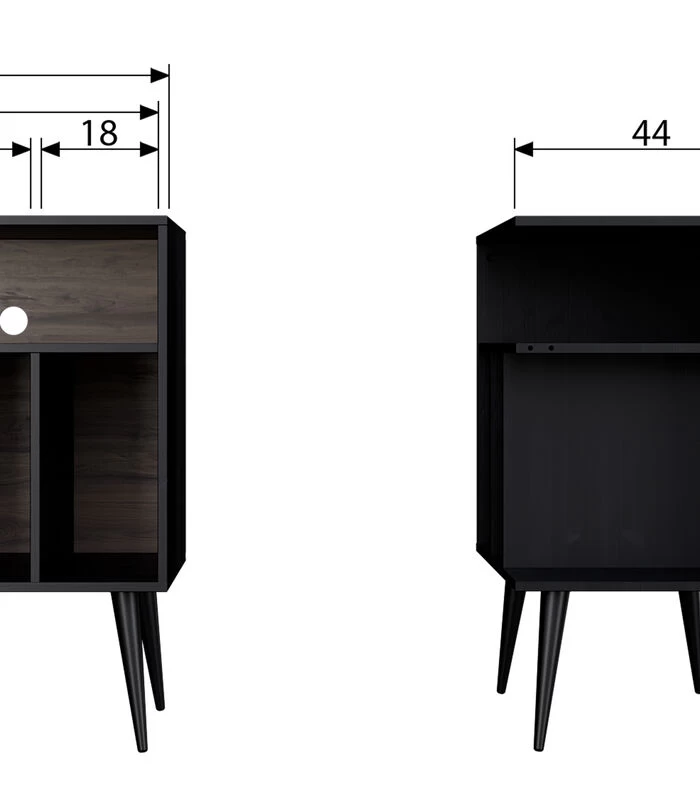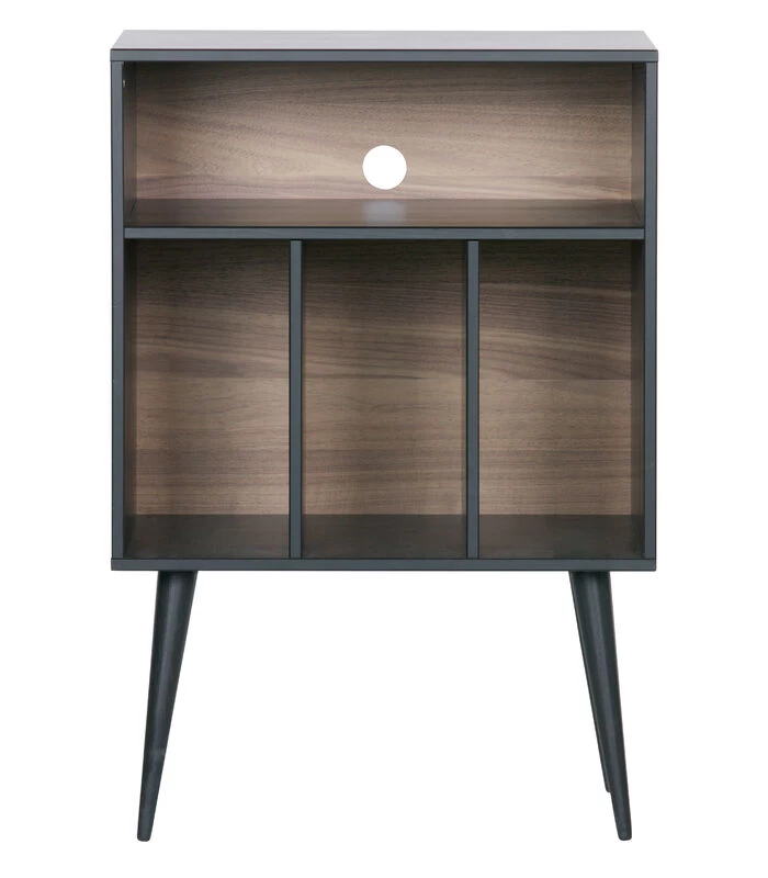 Uit de James serie van het merk WOOOD is dit bijzonder fraaie kastje. Kastje James (H 83 x B 60 cm x D 44 cm) is uitgevoerd in mat zwart gelakt grenen in combinatie met een MDF achterzijde met notenprint. Het kastje is speciaal ontwikkeld om in de 3 vakken aan de onderzijde LP’s te plaatsen ( H 35 x B 18 cm). Het brede vak bovenin is ontworpen om de versterker in te plaatsen, daar is namelijk een gat in de achterzijde van het kastje gemaakt om je snoeren doorheen te halen. Je kunt het kastje natuurlijk ook gebruiken voor andere functies!