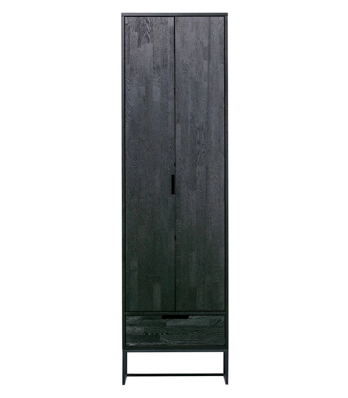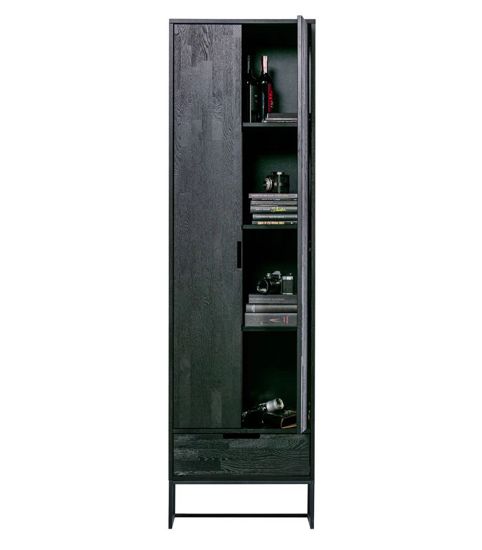 De hoge kast Silas zwart essen [fsc] van het Nederlandse merk WOOOD Exclusive is onderdeel van de serie Silas. Deze serie heeft een eigentijdse moderne uitstraling en biedt een goede basis voor het interieur. Deze hoge kast met twee deuren en lade is gemaakt van massief essen(vingerlas), heeft een geschuurde afwerking gekregen en is afgelakt in de kleur blacknight. Het onderstel is van zwart metaal. Achter de twee deuren zitten vier legplanken, de hoogte van de opbergvakken is 40 cm en de breedte is 56 cm. De diepte van de lade is 31 cm en de breedte 56 cm. Artikelkenmerken