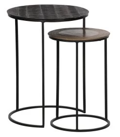 De Tate – bijzettafel set van 2 – komt uit de collectie van het Nederlandse merk WOOOD. De grootste tafel, h53xØ41cm, heeft een aluminium tafelblad met een donkerbruine finish. De kleinere tafel, 45xØ30 cm, heeft een aluminium tafelblad met een Antique Brass finish. Het onderstel van beide tafels is vervaardigd uit ijzer met een mat zwarte afwerking.