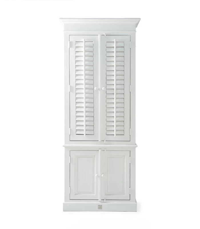 New Orleans is de grootste stad van de Amerikaanse staat Louisiana. De stad ligt aan de oevers van de rivier de Mississippi. Deze fris witte garderobekast van acaciahout is een mooie, ruime kast met beweegbare shutters. De bovenste helft biedt één vaste plank, een roede en twee verplaatsbare planken, en achter de onderste deuren bevinden zich nog drie planken.