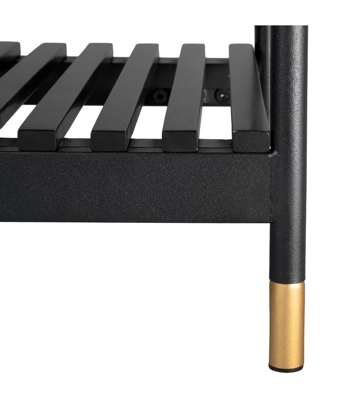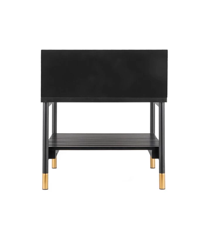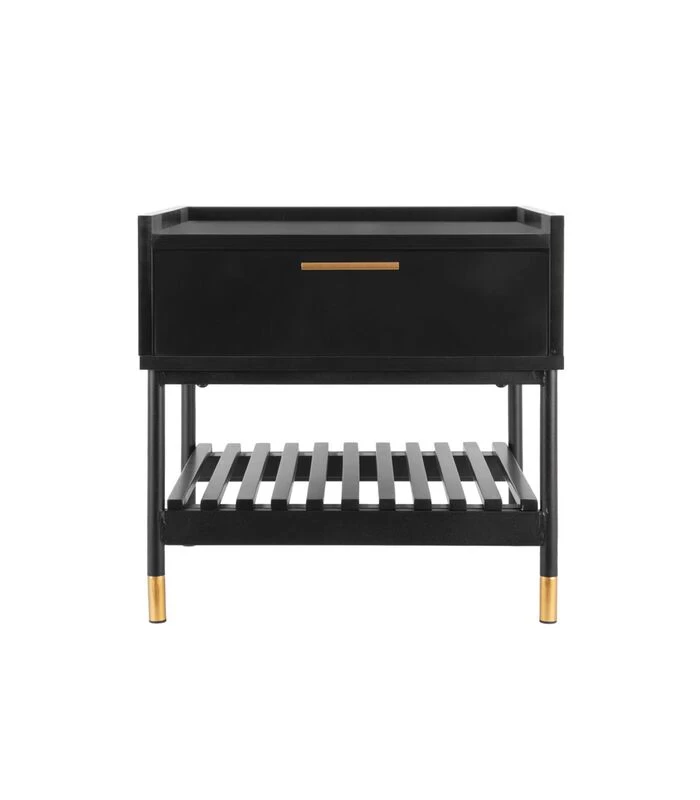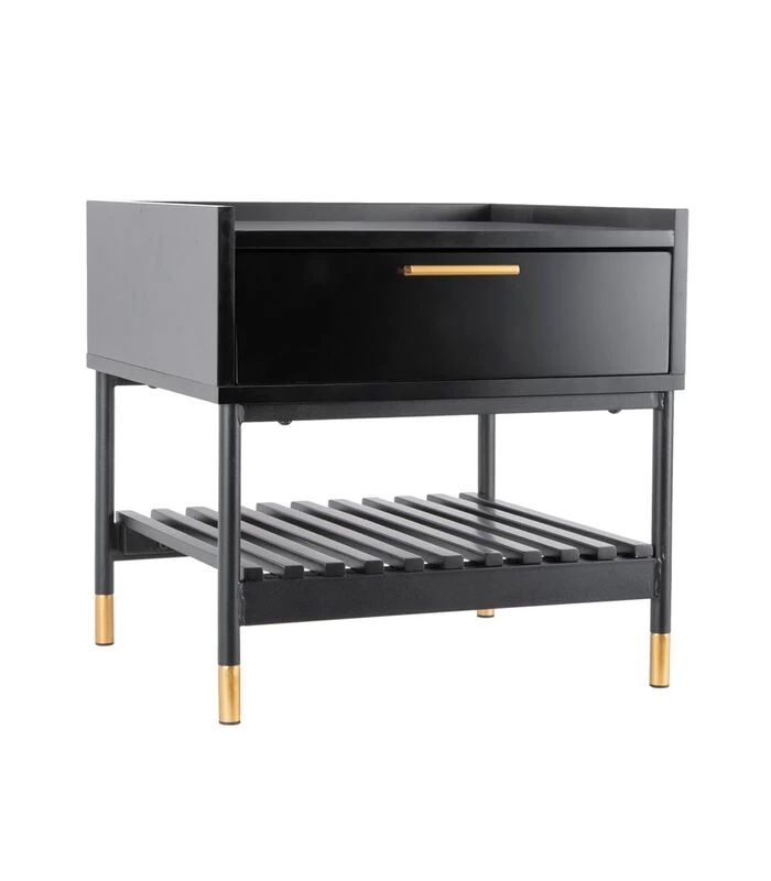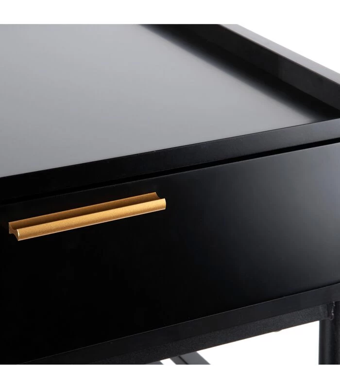 Het mat zwarte grenen in combinatie met de gouden handgreep en pootjes geven hem een sjieke look. Het handige rekje onder de lade zorgt ervoor dat je naast je wekker ook je boek of tijdschriften kwijt kunt.