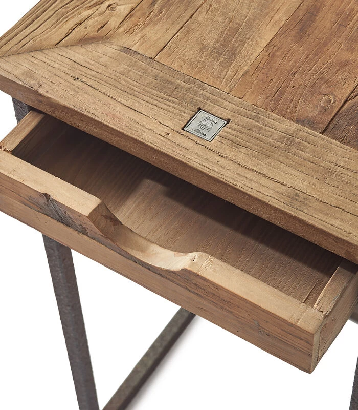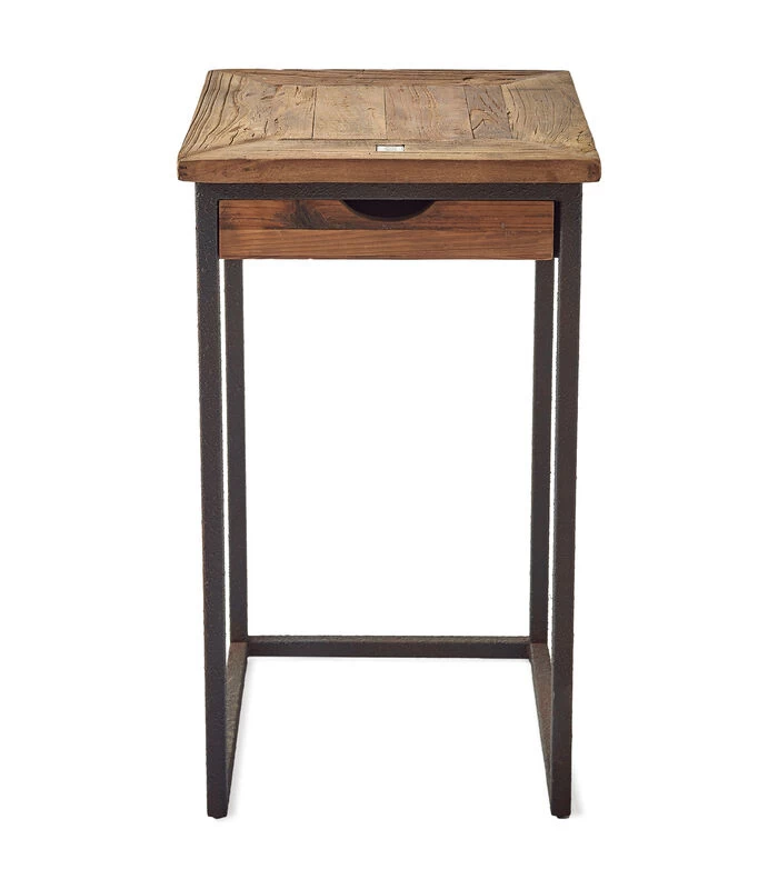 Nachtkastje van oud recycled hout en een ijzeren onderstel is voorzien van een stevige lade. De mix van oud hout en ijzer geeft het typische loft sfeertje dat het goed doet in een slaapkamer omgeving. Er is goed nagedacht om dit meubel een verfijnde en tevens industriële de uitstraling te geven.