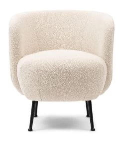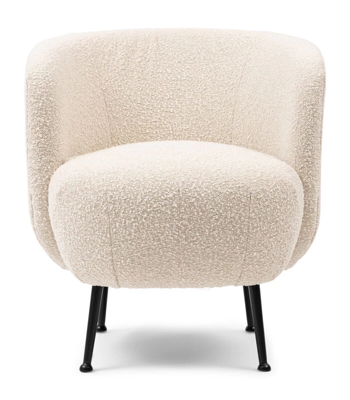 Dankzij de fijne bouclé bekleding in White Sand en de ronde vorm heeft deze eetkamerstoel een retrolook. De metalen, zwarte poten staan strak op de vloer. De stoel past erg goed in het interieur anno nu.