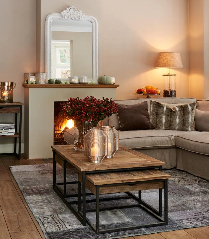 Het gerecyclede iepenhouten tafelblad in combinatie met het ijzeren frame zorgen voor een industriële doch warme look. Aan de zijkant van de twee kleine salontafels zitten handige lades. Zet de kleinere tafels speels onder de grote koffietafel voor een leuk effect. In de Shelter Island serie van Rivièra Maison zijn diverse modellen tafels en kasten te vinden, prachtig om met verschillende meubels uit deze serie eenheid in uw interieur te creëren.