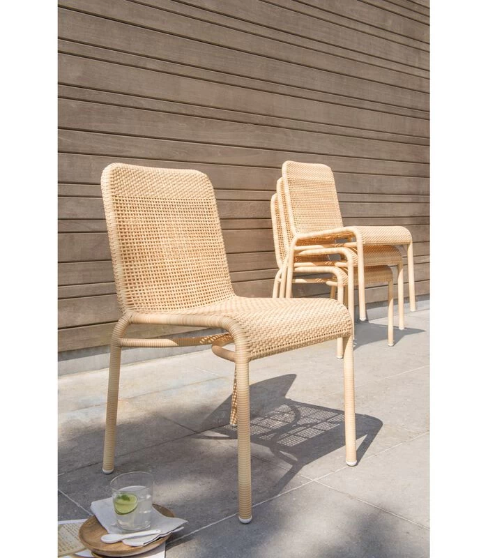 Comfortabel, nonchalant en gemakkelijk om mee te leven, de Tobago buitenstoelen zijn hier geweven met een “”natuurlijke”” gekleurde resin die een rotan vlechtwerk imiteert. Zo geniet u van de look van een natuurlijk materiaal… zonder de nadelen: zeer weinig onderhoud, geen noodzaak om de zetels ’s avonds of in de winter op te bergen, geen kleurverandering door UV–stralen of vochtigheid, enz. Onze stoel zal net zo comfortabel zijn buiten op een terras of in de tuin als binnen in de eetkamer, keuken of serre.Afmetingen: hoogte 84 x breedte 51 x diepte 57, zitting 46 cm. Gepoedercoat aluminium frame, HDPE resin vlechtwerk. Gemaakt in Indonesië .