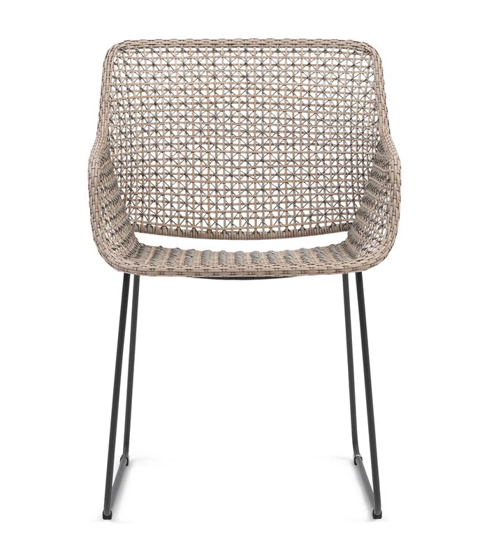 Buiten eten in de zomer is heerlijk als je ook echt lekker aan tafel kunt zitten en dat kan met deze stoel. De metalen sledepoten van het frame geven stabiliteit. Het wicker is in een speciaal patroon geweven, met een prachtig resultaat. De stoel is weerbestendig.