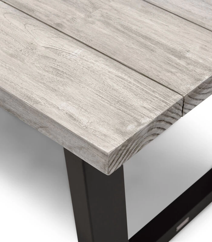 Heerlijk grote tafel om met zijn allen gezellig buiten te eten. Het blad is van teakhout, de donkerbruine poten van aluminium. Het blad heeft dikke panelen, waardoor de tafel een robuuste uitstraling heeft. Mede dankzij de rechthoekige vorm van de poten, past hij ook prima in een industrieel interieur.