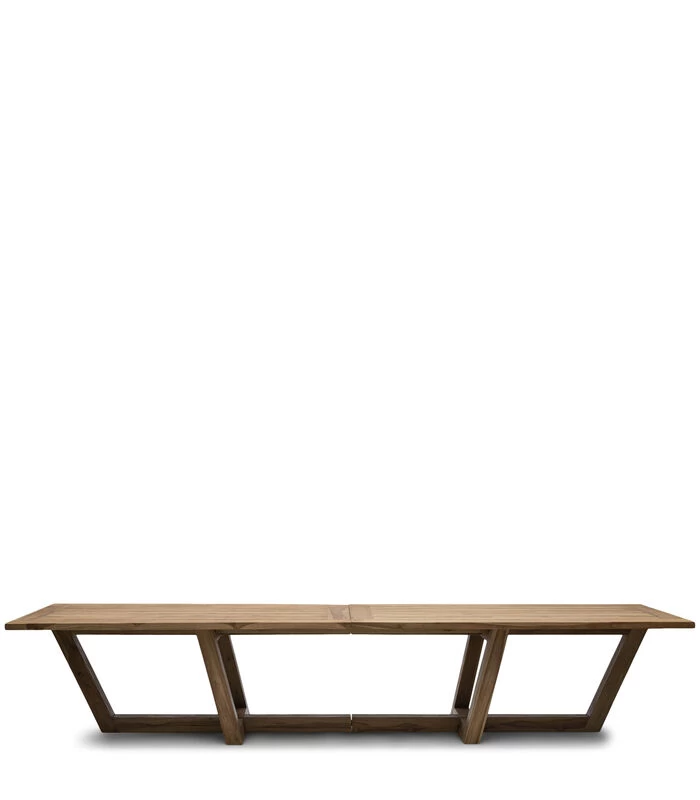 Eindeloos tafelen met zijn allen tijdens mooie zomeravonden, daar is ruimte genoeg voor aan deze tafel. Het blad is van stevig teakhout, de poten ook. Die rusten op één lange balk onder met daarop aansluitend de zijpoten. Daardoor is de tafel erg stevig. Deze eettafel is er in twee maten.