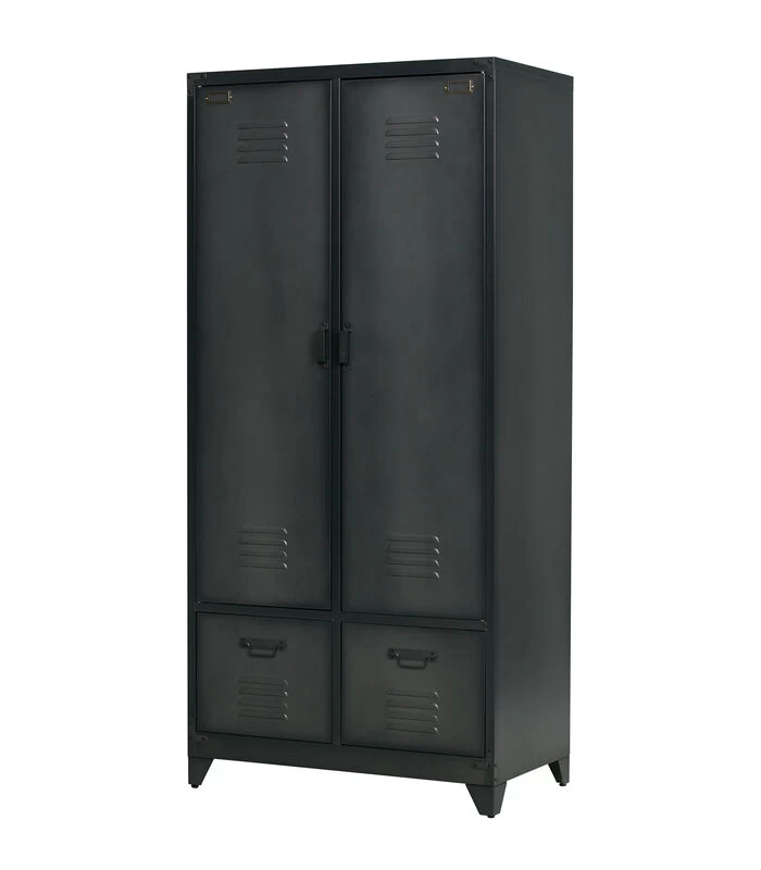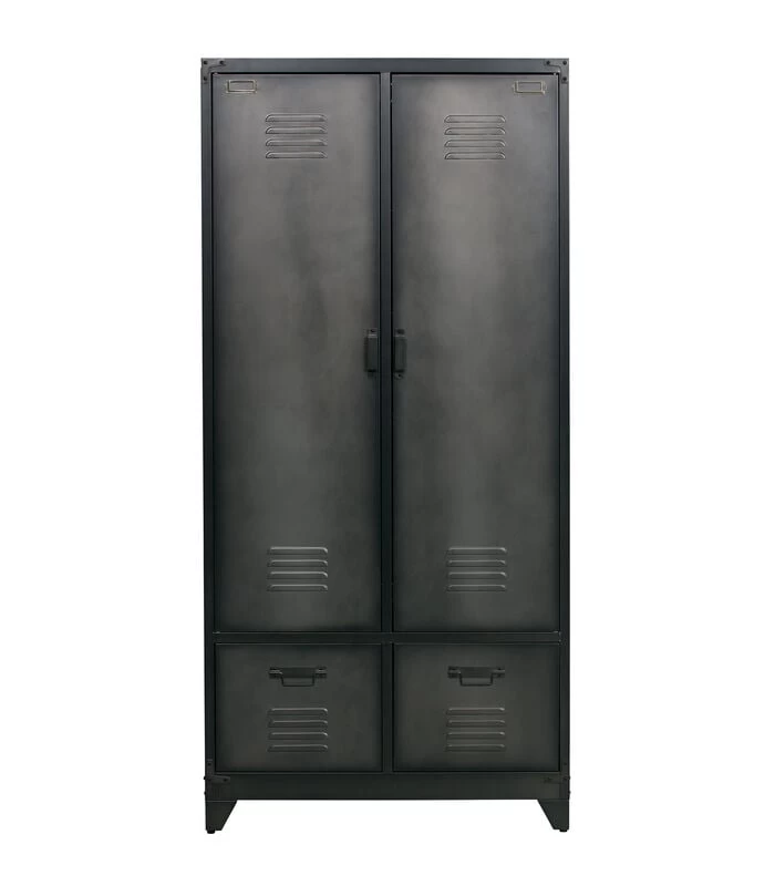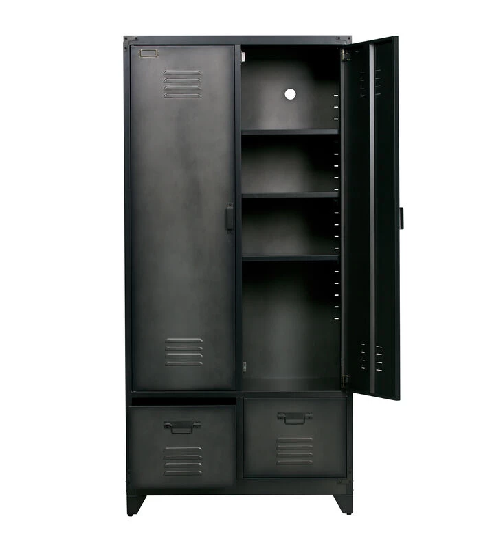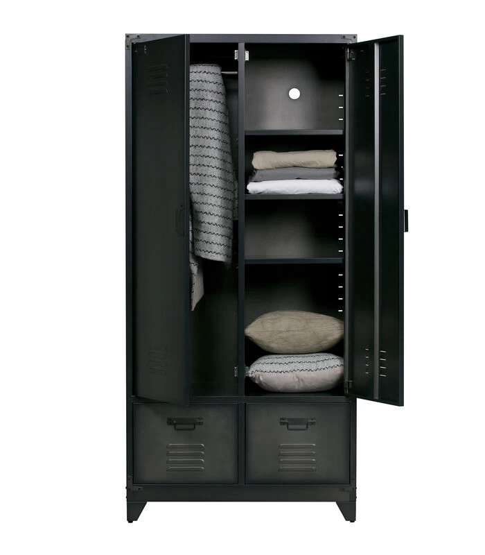 Deze metalen locker kast komt uit de collectie van het Nederlandse merk vtwonen. De kast is gemaakt van koud gerold staal met een zwarte afwerking. Het interieur van de kast bestaat uit een roede en vier legplanken. De hoogtes van de legplanken aan de rechterzijde van de kast zijn zelf te bepalen. Onderin is de kast voorzien van twee lades voor losse spulletjes. De lockerkast heeft een hoogte van 190 cm, een breedte van 90 cm en een diepte van 50 cm. De pootjes zijn 8 cm hoog, de afstand van de plank tot de roede bedraagt 127 cm. Artikelkenmerken