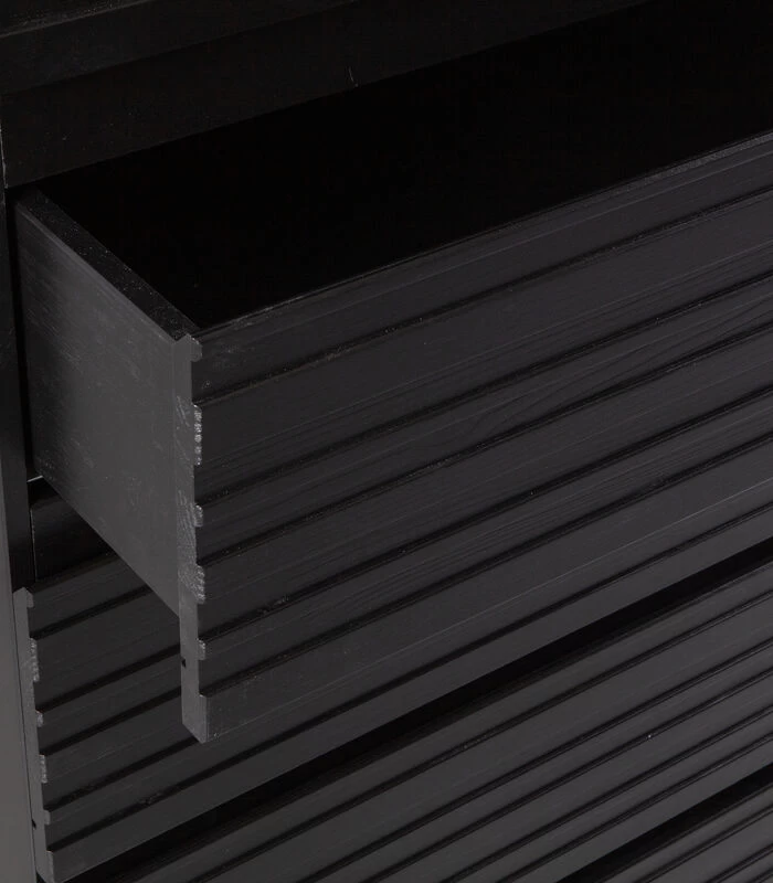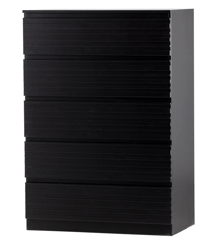De Jente ladekast is een musthave voor de verzamelaars. Deze royale ladekast komt uit de collectie van het Nederlandse interieurlabel WOOOD en biedt met zijn vijf laden een zee aan verborgen opbergruimte. De Jente ladekast is gemaakt van sterk, FSC–gecertificeerd grenenhout en afgewerkt in een diepzwarte kleur. De vijf laden zijn voorzien van een geluidloos soft–close systeem en een onzichtbare greep.
