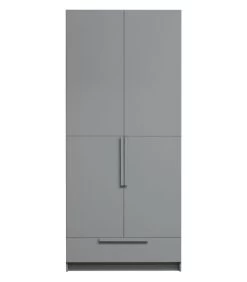 Deze royale, strakke en elegante 2–deurs hangkast Pure van het merk WOOOD is gemaakt van massief FSC gecertificeerd grenen, gelakt in een moderne betongrijze kleur en heeft een geschuurde afwerking. De Pure kast (215x95x60) is een 2–deurs hangkast en maakt deel uit van de splitdeur serie. Deze deur heeft een groef over de breedte van de deur, waardoor het de illusie creëert alsof de kast beschikt over meerdere deuren. De deuren zijn voorzien van een softclose systeem en beschikken over een robuuste greep. Het interieur van de Pure kast wordt standaard geleverd met hanggedeelte voorzien van metale roede en 1 legplank over de gehele breedte van de kast. Onderaan de kast bevindt zich nog een lade, voorzien van softclose systeem, waar je spullen in kunt opbergen die onttrokken worden aan het oog.