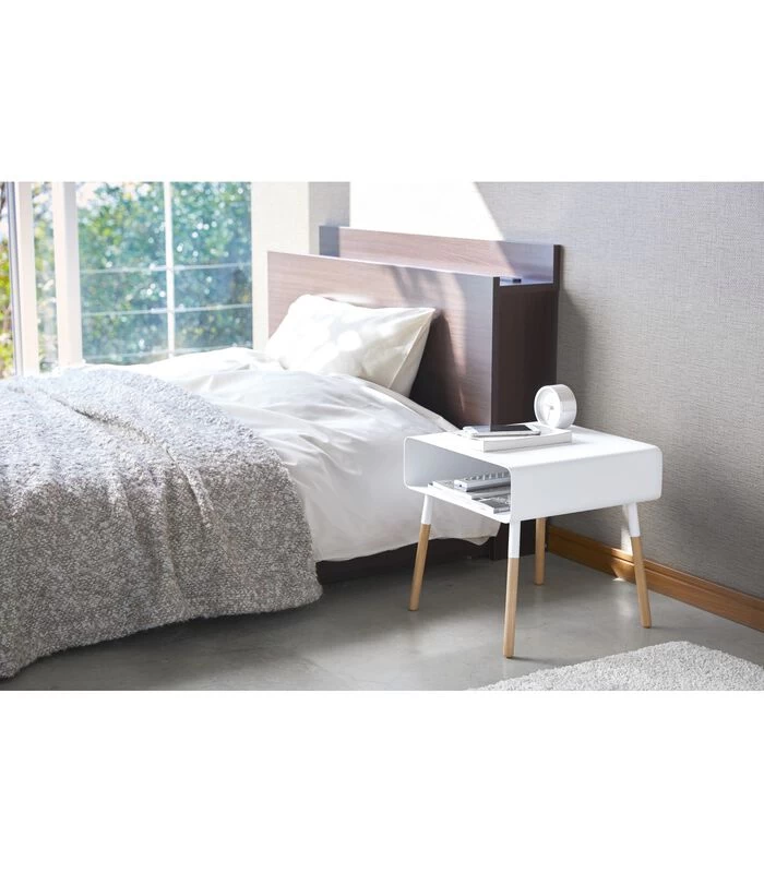 De lage bijzettafel van Yamazaki bespaart ruimte en biedt tegelijkertijd voldoende opbergruimte voor bijvoorbeeld je mobiele telefoon en tijdschriften. Door zijn perfecte hoogte past hij goed naast je bank of bed en helpt bij het creëren van een stijlvolle sfeer.