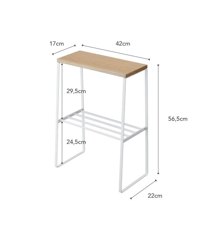 Deze elegante bijzettafel van Yamazaki heeft twee opbergruimtes. De houten plank bovenop geeft een mooi accent aan je woonkamer en met de plank eronder heb je extra ruimte voor boeken en tijdschriften. Gemaakt van staal en hout en ontworpen in Japan.