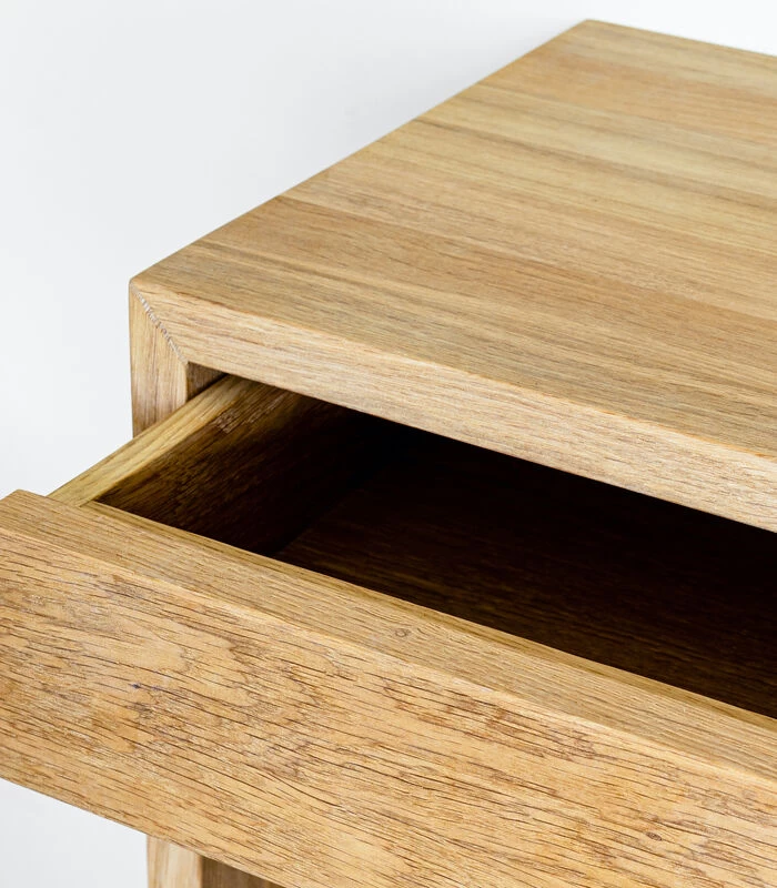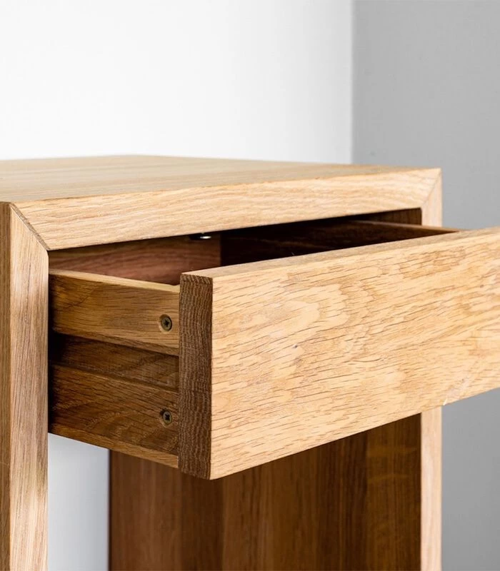 Het nachtkastje is gemaakt van massief eikenhout met een natuurlijke olieafwerking. Met een strakke, minimale stijl toont het de schoonheid van de natuurlijke nerf van het hout. Het heeft een handige lade en een plank voor het opbergen van uw favoriete boeken. Compact en functioneel het kan ook aan de muur worden gemonteerd en gebruikt als zwevende plank / lade niet alleen in de slaapkamer, maar ook rond het huis. Dit product is gemaakt van natuurlijk massief eikenhout, elk stuk is uniek qua kleur, natuurlijke kenmerken, nerfpatronen en afwerking. Het is dus mogelijk dat u enkele verschillen tussen artikelen van eenzelfde productlijn ziet; dit is onderdeel van de natuurlijke schoonheid van onze producten. Voor het binnenmateriaal van het product kunnen andere soorten hardhout worden gebruikt.